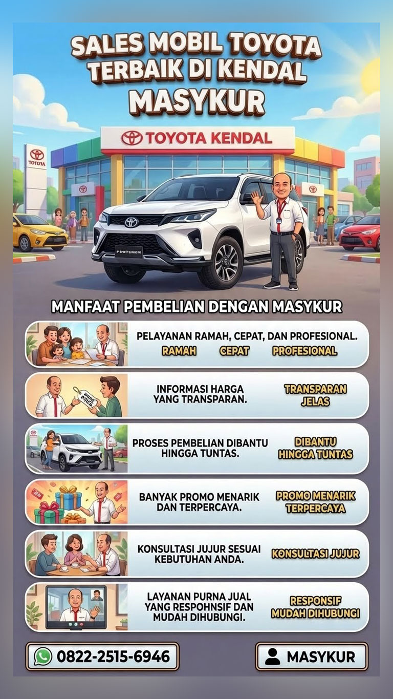 Toyota Kendal – Hubungi Sales Marketing Mobil Di Dealer Toyota Kendal Untuk Info Alamat Dealer, Harga Terbaru, Promo, Diskon, Cashback, Paket Kredit, Simulasi Kredit, Test Drive Mobil Toyota Agya, Yaris, Calya, Avanza, Veloz, Kijang Innova, Kijang Innova Zenix, Voxy, Alphard, Vellfire, Raize, Rush, Yaris Cross, Fortuner, Corolla Cross, BZ4X, RAV4, Land Cruiser, Vios, Corolla Altis, Camry, Prius, GR Yaris, GR Corolla, GR 86, GR Supra, Hilux S Cab, Hilux D Cab, Hilux Rangga, Hiace Commuter, Hiace Premio, Dyna. Tersedia Promo DP / Uang Muka Kredit Murah Cicilan Ringan dan Proses Cepat. Hubungi Sales Marketing Toyota Kendal Segera dan Kunjungi Alamat Showroom (Dealer) Kami Atau Jika Anda Sibuk Kami Bersedia Berkunjung Ke Tempat Anda. Jika Mobil Anda Mengalami Kerusakan Atau Ingin Service Silahkan Bawa Ke Bengkel Resmi Kami. Menerima Tukar Tambah Mobil Bekas / Seken Atau Jual Beli Mobil Second. Dapatkan Info Promo Terbaru Toyota Kendal Setiap Bulan Januari Febuari Maret April Mei Juni Juli Agustus September Oktober November Desember Setiap Tahun 2025 2026 2027.